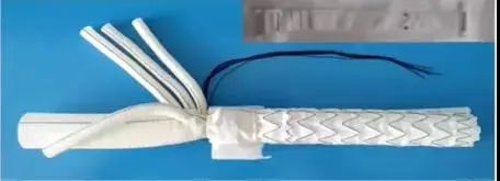 一體化免縫合帶支架人工血管系統(tǒng)包括人工血管和免縫合扣帶兩部分,通過主動脈覆膜支架進(jìn)行腔內(nèi)修復(fù),一般由股動脈導(dǎo)入,到達(dá)病變部位后釋放支架,支架撐開后固定在主動脈內(nèi)壁,將病變血管覆蓋,重建安全通路,恢復(fù)血流循環(huán)。