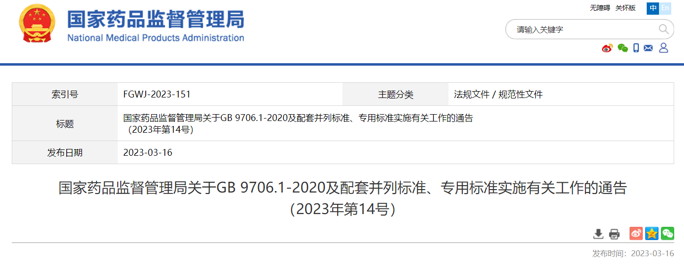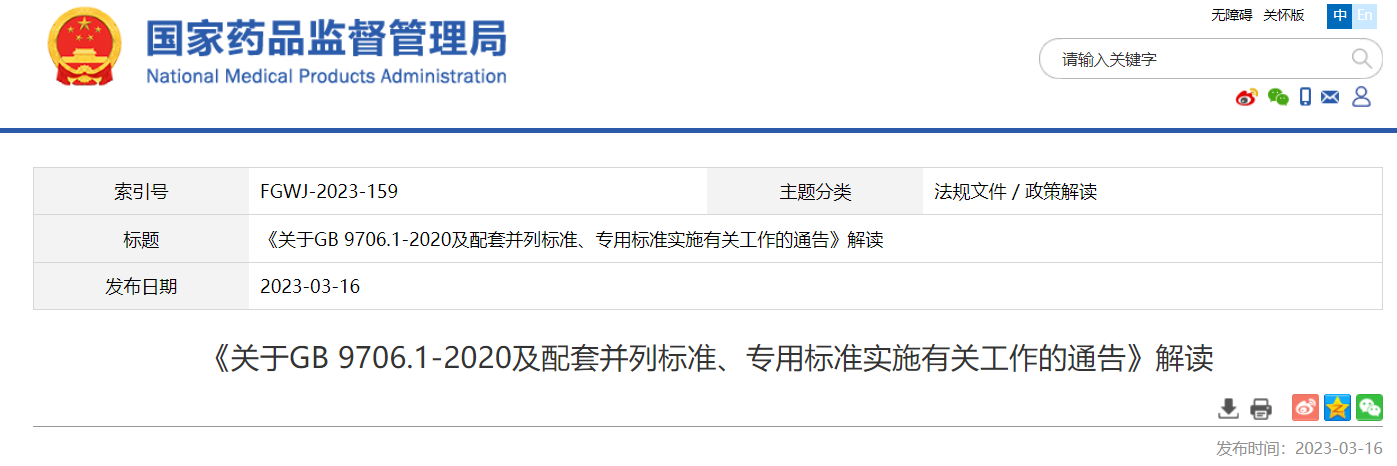 近日,國家藥監(jiān)局發(fā)布《關(guān)于GB 9706.1-2020及配套并列標(biāo)準(zhǔn)、專用標(biāo)準(zhǔn)實施有關(guān)工作的通告》(2023年第14號,以下簡稱通告)?,F(xiàn)就通告出臺的背景、相關(guān)內(nèi)容說明如下:
