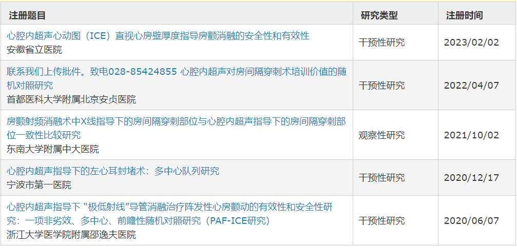 公開數(shù)據(jù)顯示,試驗(yàn)設(shè)計(jì)大多采取前瞻性、多中心、隨機(jī)對(duì)照方法,組別為ICE組和非ICE組(TEE經(jīng)食管超聲等),部分研究的樣本量為400例左右(1:1),公開資料顯示,此類臨床試驗(yàn)的部分入組標(biāo)準(zhǔn)為“年齡≥18周歲且≤85周歲,性別不限;計(jì)劃行心臟的心內(nèi)和大血管腔內(nèi)成像、心腔內(nèi)多普勒血流評(píng)估、以及心腔內(nèi)介入手術(shù)的患者。”
