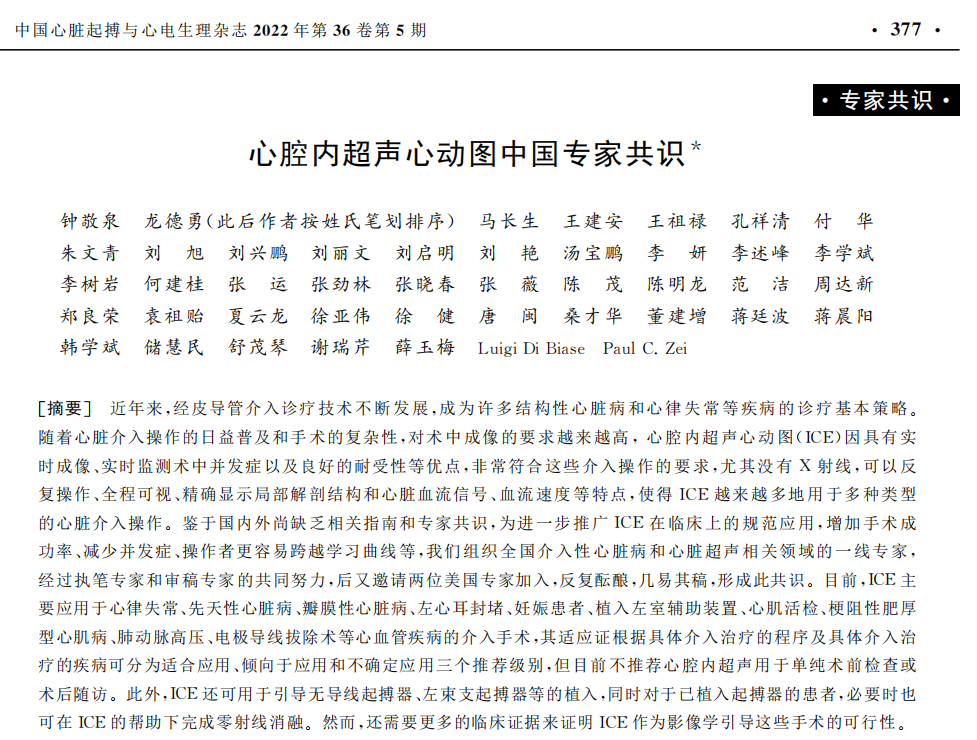 鑒于目前國際上缺乏相關(guān)指南,為促進(jìn)和規(guī)范ICE的臨床應(yīng)用,為臨床醫(yī)生提供指導(dǎo),進(jìn)一步完善心血管介入診斷和治療方案,2022年10月,由國內(nèi)外數(shù)十位頂尖專家學(xué)者編寫完成全球首個(gè)心腔內(nèi)超聲專家共識(shí),聯(lián)合在Frontiers in Cardiovascular Medicine上發(fā)表,推動(dòng)了心腔內(nèi)超聲心血管介入領(lǐng)域的的規(guī)范化應(yīng)用。