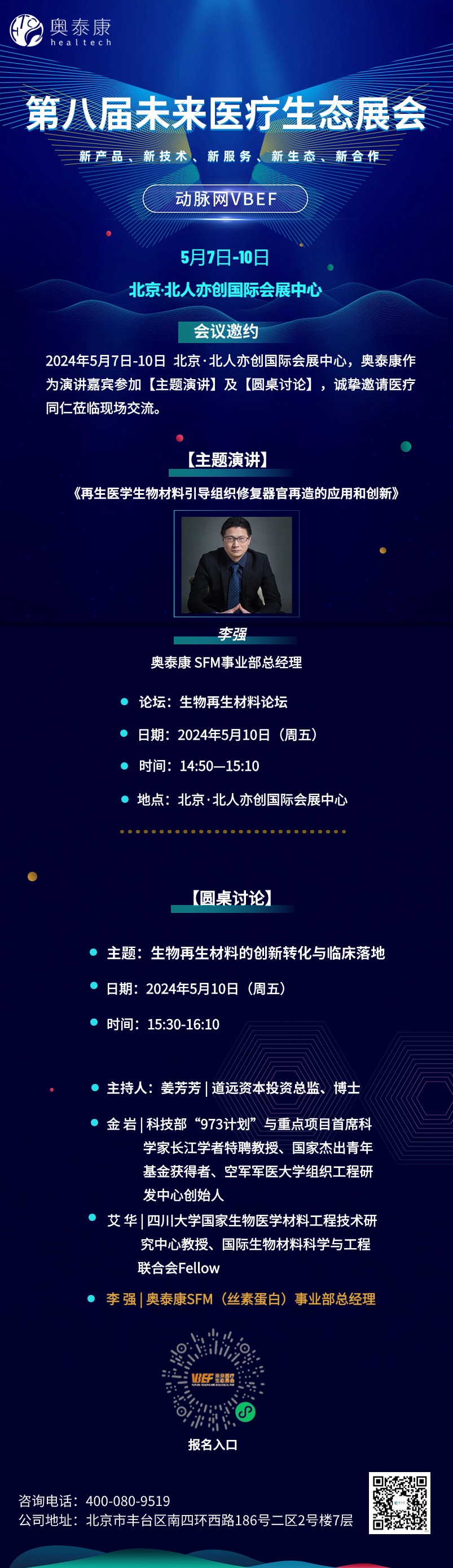 ??動脈網(wǎng)·VBEF——第八屆未來醫(yī)療生態(tài)展會,奧泰康·再生醫(yī)學(xué)生物材料演講???5月10日,與您相約??北京·北人亦創(chuàng)國際會展中心5月7日-10日,動脈網(wǎng)VBEF第八屆未來醫(yī)療生態(tài)展會將于北京·北人亦創(chuàng)國際會展中心舉行,奧泰康作為演講嘉賓,受邀參加主題演講及圓桌討論,誠摯邀請醫(yī)療同仁屆時蒞臨現(xiàn)場交流。