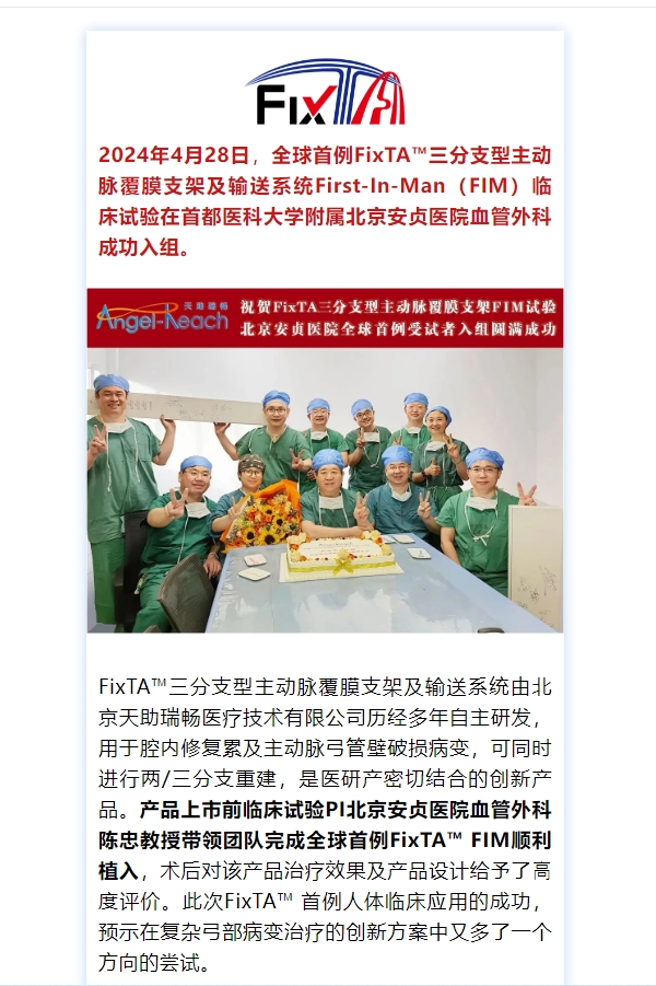 MA里程碑 全球首例北京天助瑞暢FixTA?三分支型主動(dòng)脈覆膜支架及輸送系統(tǒng)FIM臨床試驗(yàn)成功入組編者薦語:
