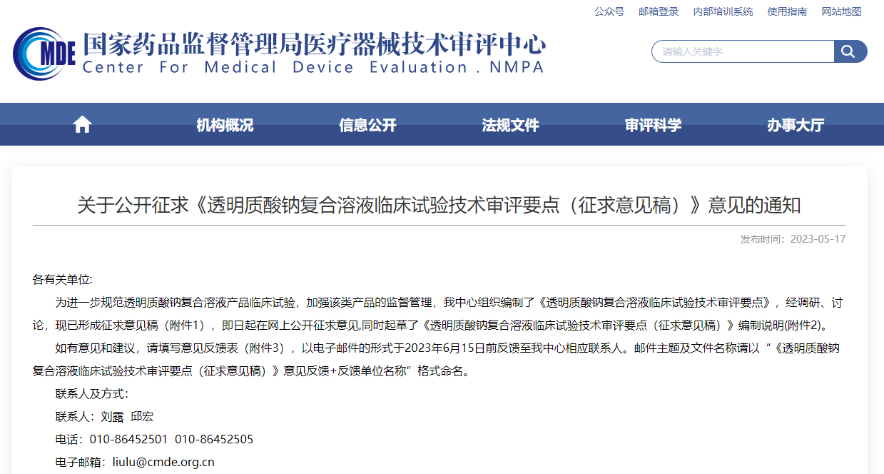 ▲ 《透明質(zhì)酸鈉復(fù)合溶液臨床試驗(yàn)技術(shù)審評(píng)要點(diǎn)(征求意見稿)》 (來源:器審中心)