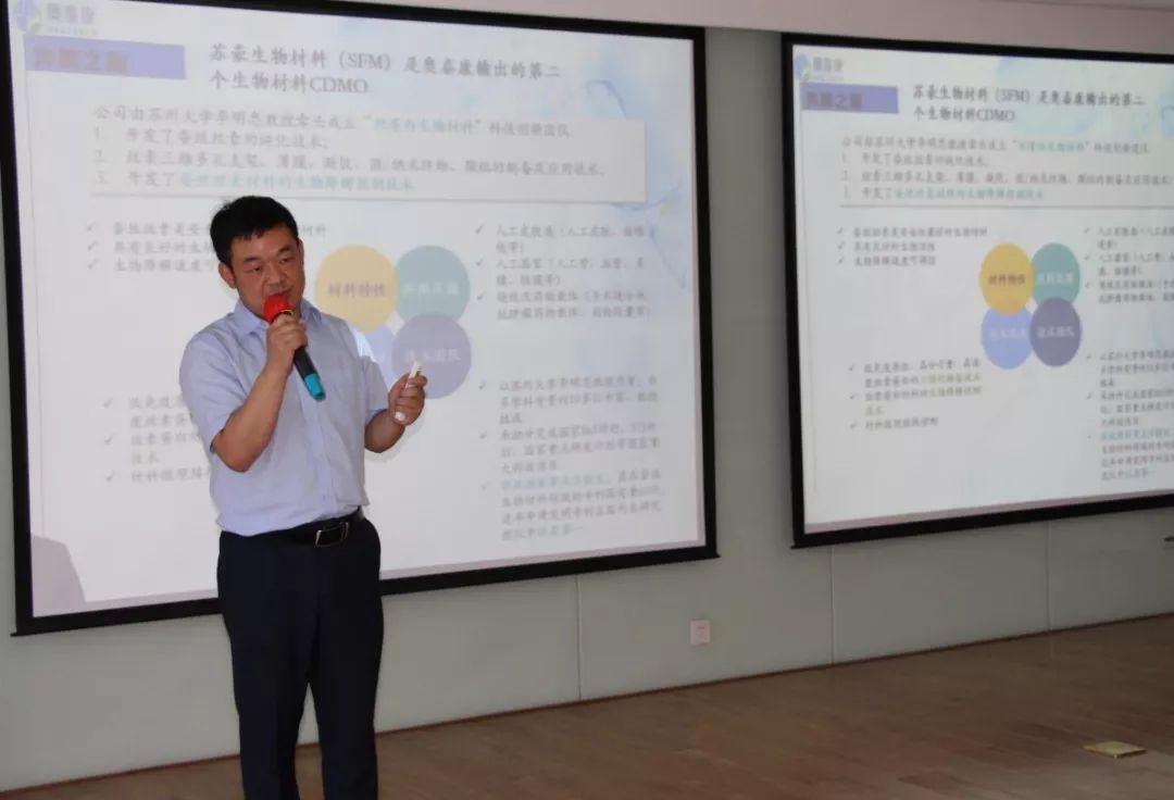 培訓(xùn)會在下午1:30準時開始,集團CEO饒總對公司整體發(fā)展做詳細講解,饒總分別從“企業(yè)發(fā)展歷程”、“管理團隊介紹”、“我們的未來發(fā)展”三大方面進行介紹,培訓(xùn)中,饒總憶苦思甜,深情講述奧泰康發(fā)展初期的鳳凰涅槃,在場員工無一不為之動容,為公司初期艱苦奮斗,堅守信念的精神所感動;之后奧泰康進入快速發(fā)展階段,先后獲得多項創(chuàng)新醫(yī)療器械批件,并參與多項國家重點研究項目,并與多家國內(nèi)外知名企業(yè)合作,擁有醫(yī)療器械CDMO行業(yè)唯一的已投產(chǎn)GMP車間等等,從最初單項的CRO項目服務(wù)延伸到CRO/CDMO一體化服務(wù),致力于成為醫(yī)藥行業(yè)MA解決方案的領(lǐng)導(dǎo)者;