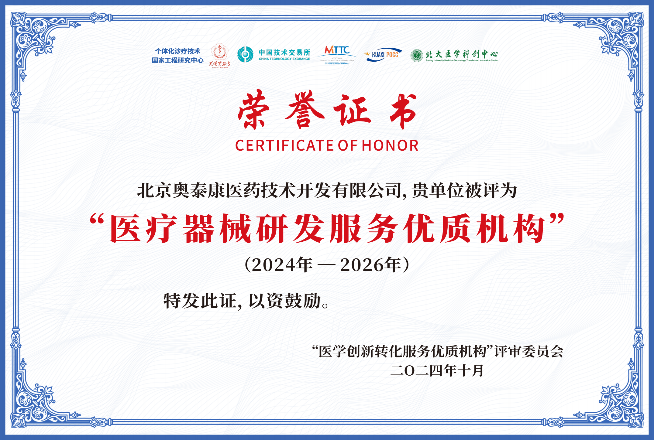 北京奧泰康醫(yī)藥技術(shù)開發(fā)有限公司被評為“醫(yī)療器械研發(fā)服務(wù)優(yōu)質(zhì)機(jī)構(gòu)”,集團(tuán)副總閆江薇女士出席會議并參加榜單發(fā)布儀式。